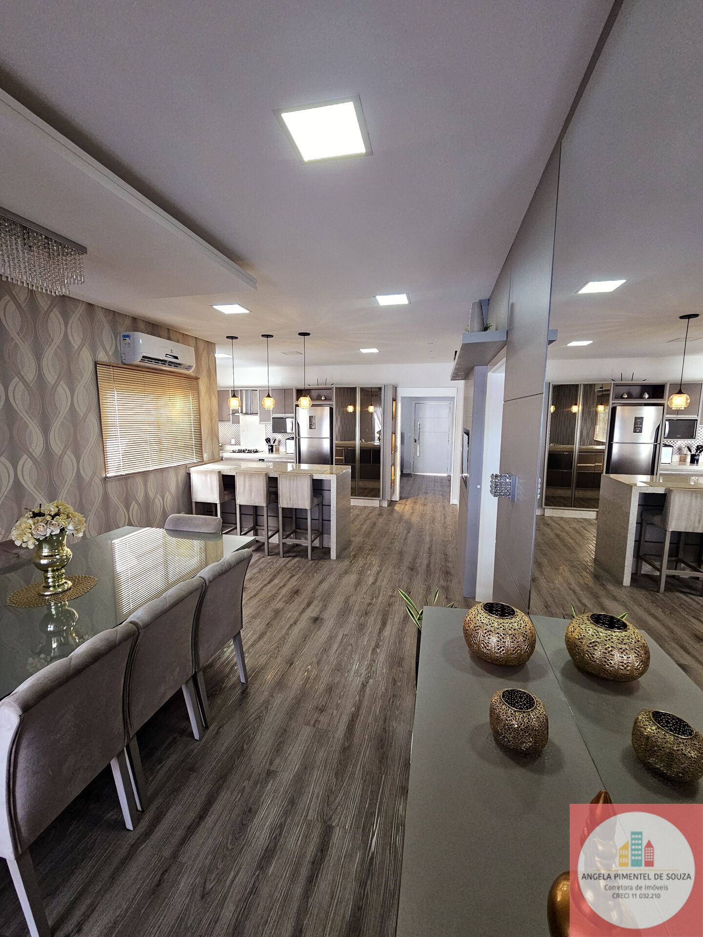 Os acabamentos são de primeira linha, com piso vinílico em toda a casa e porcelanato nos banheiros e áreas comuns. As janelas em alumínio com vidros laminados garantem isolamento acústico e térmico, enquanto o projeto de iluminação foi planejado para valorizar cada espaço.